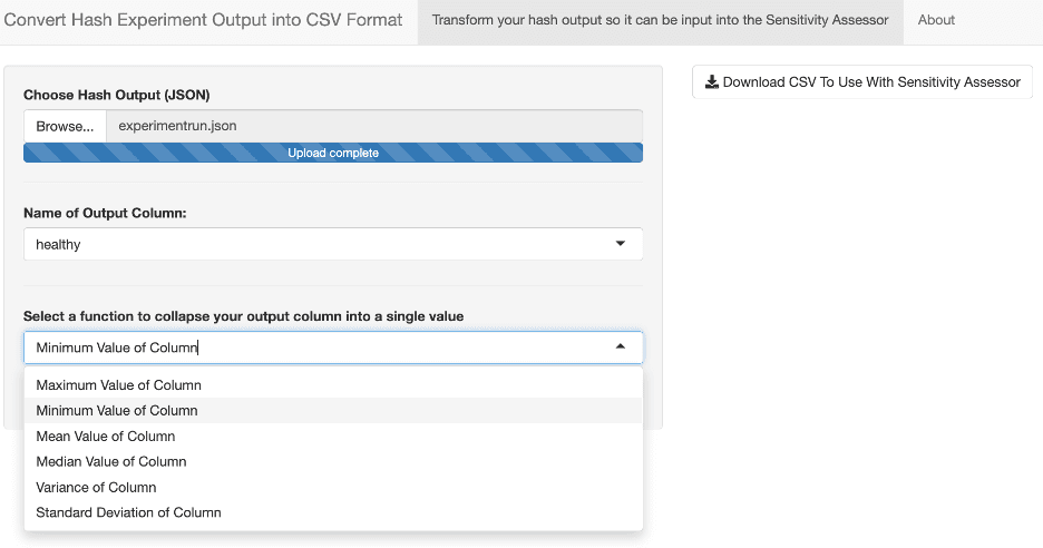 After the experiment run finished executing, we downloaded the output as JSON, and uploaded it into the HASH to Sensitivity Assessor web utility. To explore our research question, we selected the number of healthy people in the simulation run as the Output Column and used the “minimum” function to identify simulation runs with no healthy people in the simulated population at a point in time (see Figure 11). The CSV file produced was then loaded into the Sensitivity Assessor for analysis (see Figure 12).