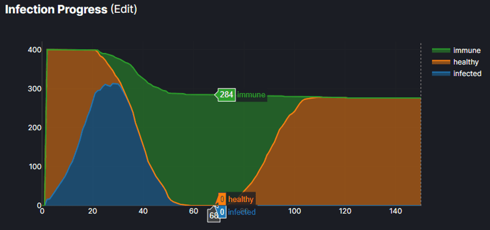 The following screen capture shows the graph of the infection process for one of the experiments that was created. It highlights a simulation run where the number of healthy agents falls to zero.