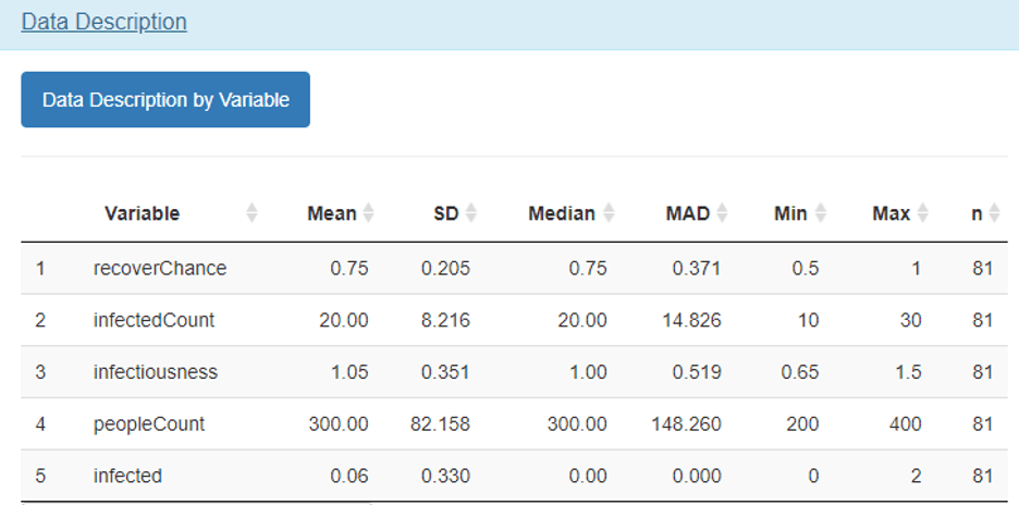 The Sensitivity Assessor provides data analysis capabilities that facilitate exploration and sanity checking of the variables from model inputs and outputs. A data description of each variable within the input file is provided using descriptive statistics. The goal is to provide insight into the central tendency of each variable (i.e., mean and median), the distribution around that tendency (i.e., standard deviation (SD) and median absolute deviation (MAD)), minimum (Min) and maximum (Max) values, and the number of samples (n).